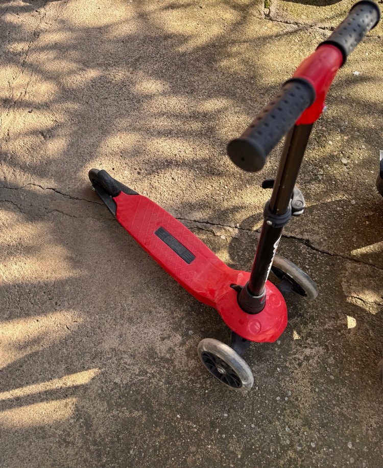 Canlı renkli, kırmızı tabanlı çocuk scooterı. Üç tekerlekli, tutuşu kolay lastik saplıdır.