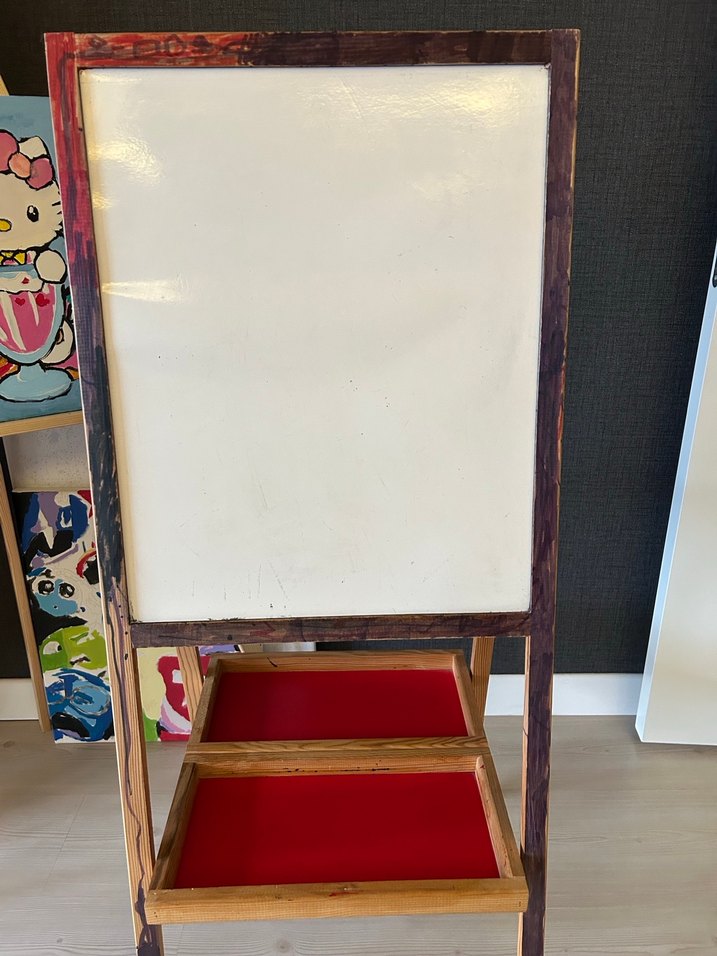 Koyu kırmızı çerçeveli, üzerinde beyaz tahta ve iki kırmızı raf bulunan ahşap çocuk standı.