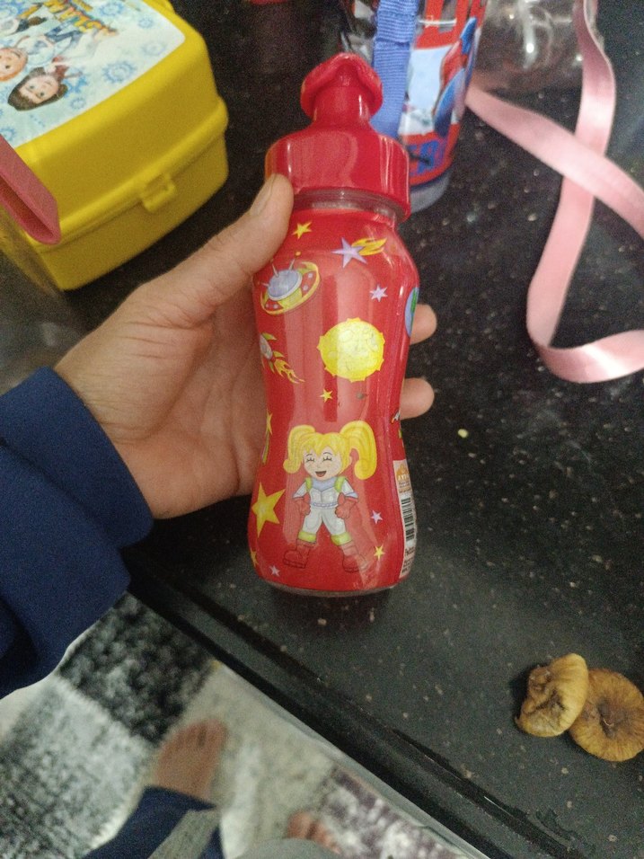 Kırmızı renkli, yıldız ve çizgi film karakteri desenli çocuk termos matara. Çocukların kolay tutması için tasarlanmış, güvenli kapaklı.