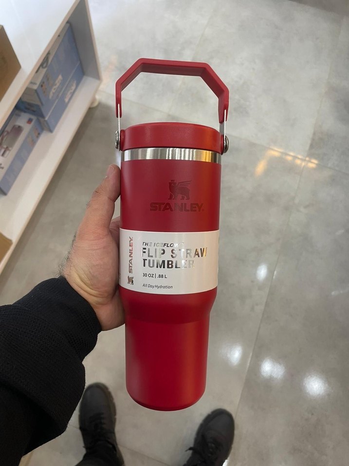 Stanley markalı kırmızı çocuk termos şişesi, flip pipet ve sağlam tutma sapına sahiptir. 0,48 litre kapasitelidir ve içecekleri sıcak veya soğuk tutar.