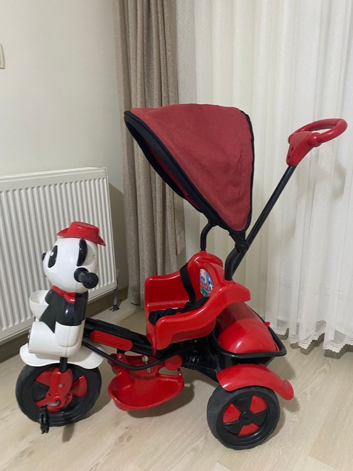 Kırmızı çocuk üç tekerlekli bisiklet, gölgelik, sırt dayamalı konforlu koltuk ve panda figürlü ön tasarıma sahiptir. Sağlam çerçeve ve üç tekerlekle dengelidir. Ankara içi olursa iyi olur