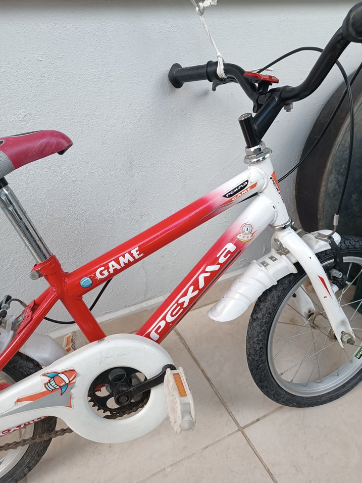 Kırmızı ve renkli tasarıma sahip OGAME markalı sağlam çocuk bisikleti. Rahat tutma yerleri bulunur.
