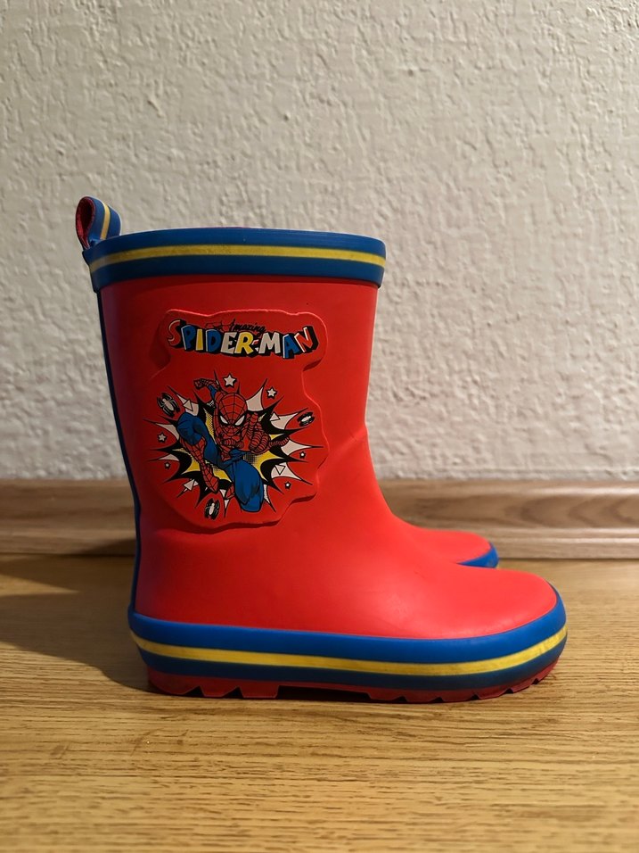 Kırmızı renkli, Spider-Man baskılı çocuk yağmur çizmesi. Dayanıklı kauçuk. Temiz ve hasarsız.