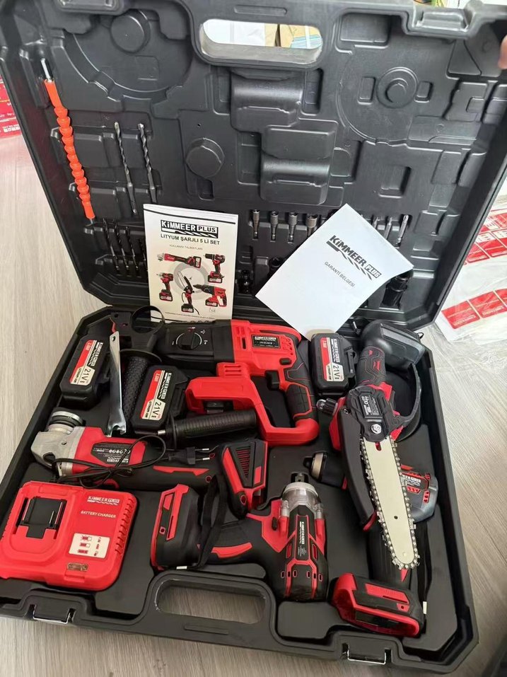 Kırmızı renkli, matkap, çekiç, mini testere ve şarj cihazı içeren çok amaçlı güç seti, taşıma kutusunda düzenli şekilde yer alıyor. sıfır kullanılmadı