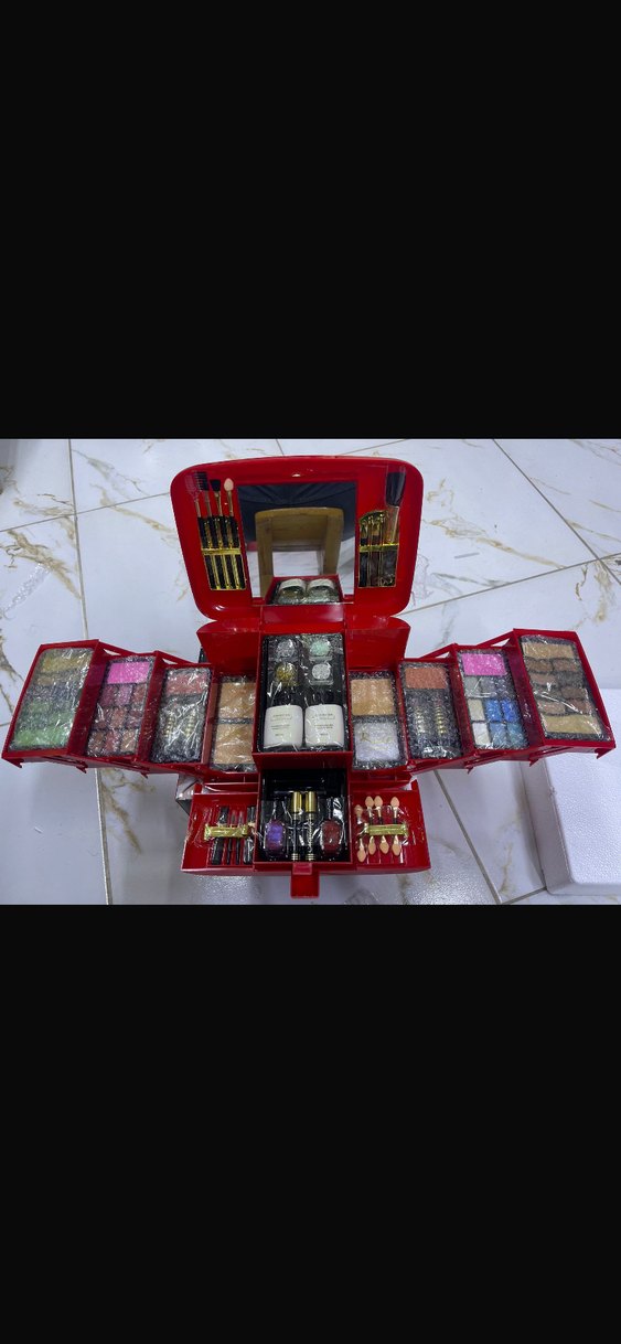 Canlı kırmızı makyaj paleti, çeşitli farlar ve kozmetikler içeren çok bölmeli yapıya ve kullanışlı ayna içerir.