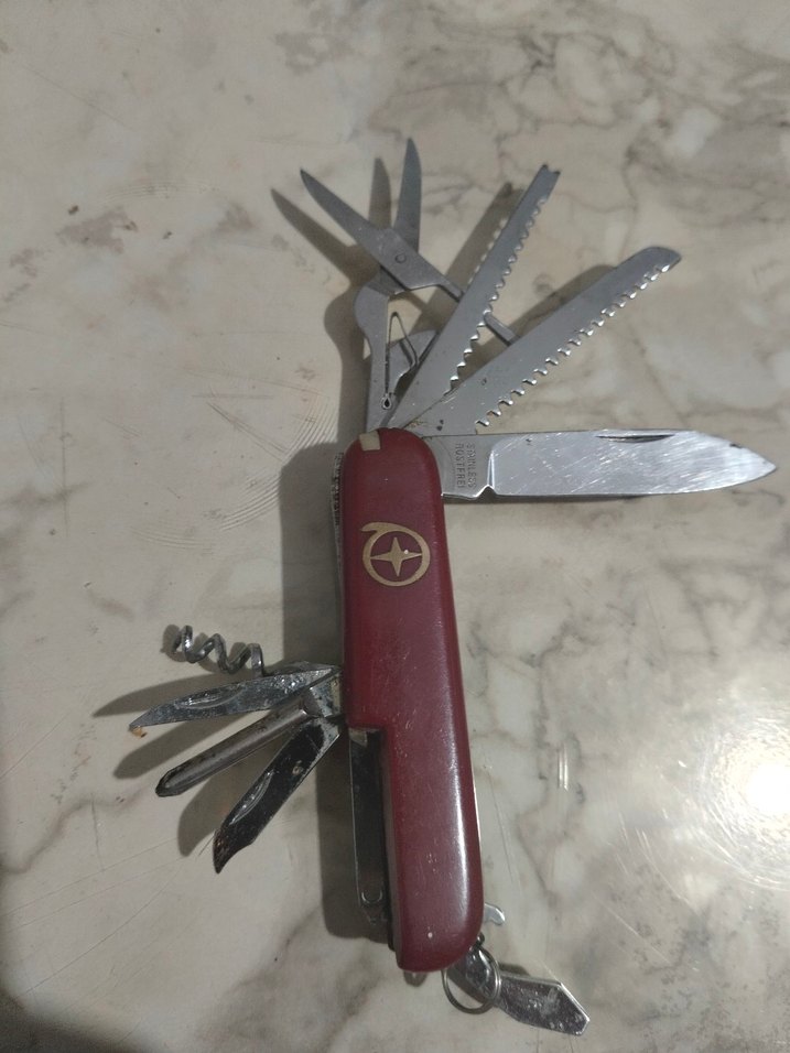 Koyu kırmızı çok fonksiyonlu çakı, çeşitli bıçaklar, makas ve tirbuşon gibi araçlar içerir.