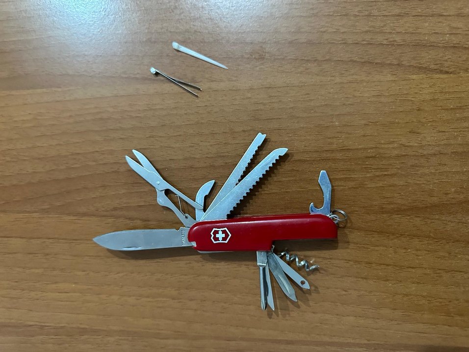 Kırmızı çok fonksiyonlu çakı, çeşitli bıçaklar, tirbuşon ve makas içerir, farklı işler için uygundur.