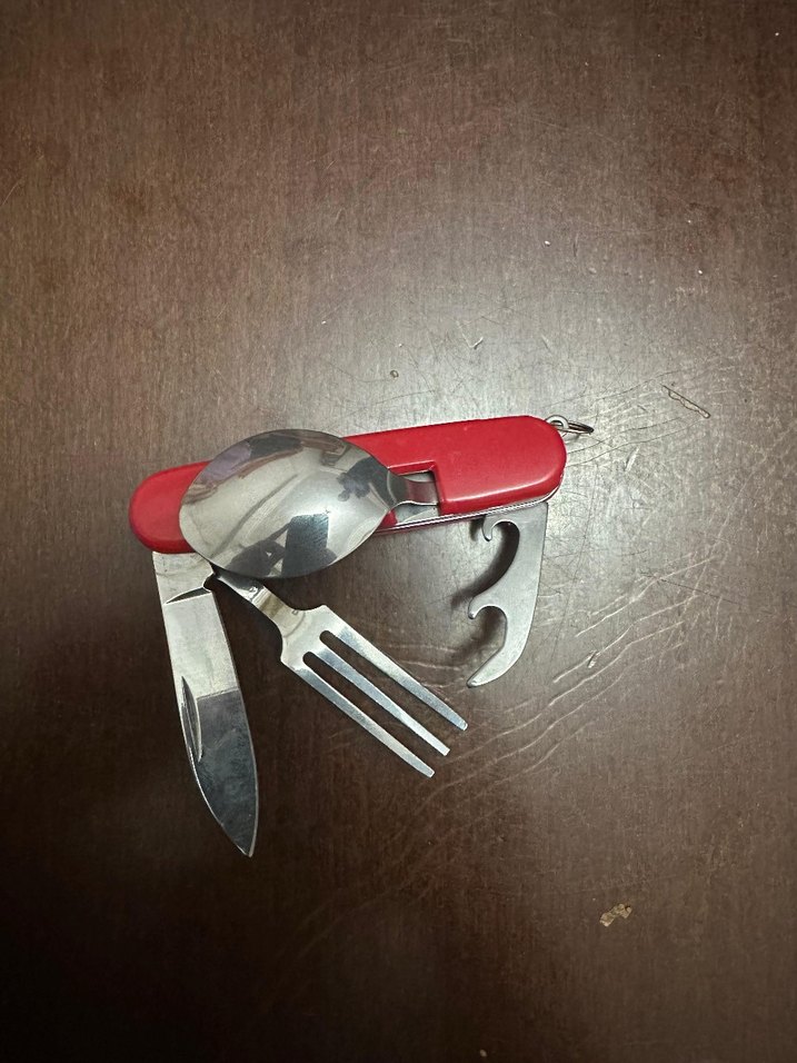 Kompakt tasarımlı kırmızı çok fonksiyonlu katlanabilir çakı; kaşık, çatal, bıçak ve şişe açacağı içerir. Kullanılmış ama iyi durumda