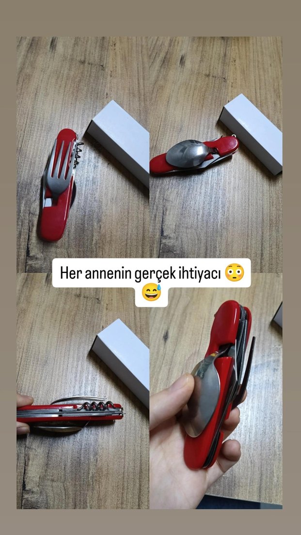 Kırmızı çok fonksiyonlu katlanabilir çatal, kaşık ve tirbuşon içerir. Üzerinde "Her annenin gerçek ihtiyacı" yazısı bulunur.