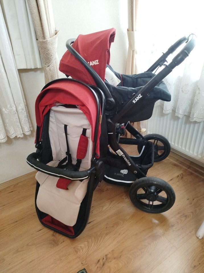 Koyu kırmızı renkte, sağlam yapılı, ayarlanabilir oturma pozisyonlu ve konforlu pedli iç kısıma sahip trawel sistem bebek arabası puset ve port bebesiyle beraber yen doğan itibariyle kullanılır