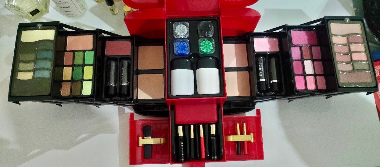Kırmızı makyaj paleti, koyu canlı göz farları, rujlar ve aplikatörler içerir. fondöten ve fırçalar eskimiş. rujlar ve farlar, pudralar tertemiz kullanılmamış. 1 yıldır almışım. sadece 1 yada 2 kez kullanmisimdir. herşey görsellerde mevcut. almadan önce msj çekin. iade kabul etmiyorum. hassas ürünler olduğu için.