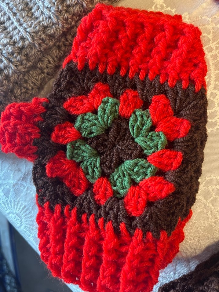 Canlı kırmızı, yeşil ve kahverengi tonlarında, örgü dokulu, bohem tarzda kadın eldiveni. Yumuşak ve sıcak kumaştan retro hippie görünümü sağlar.