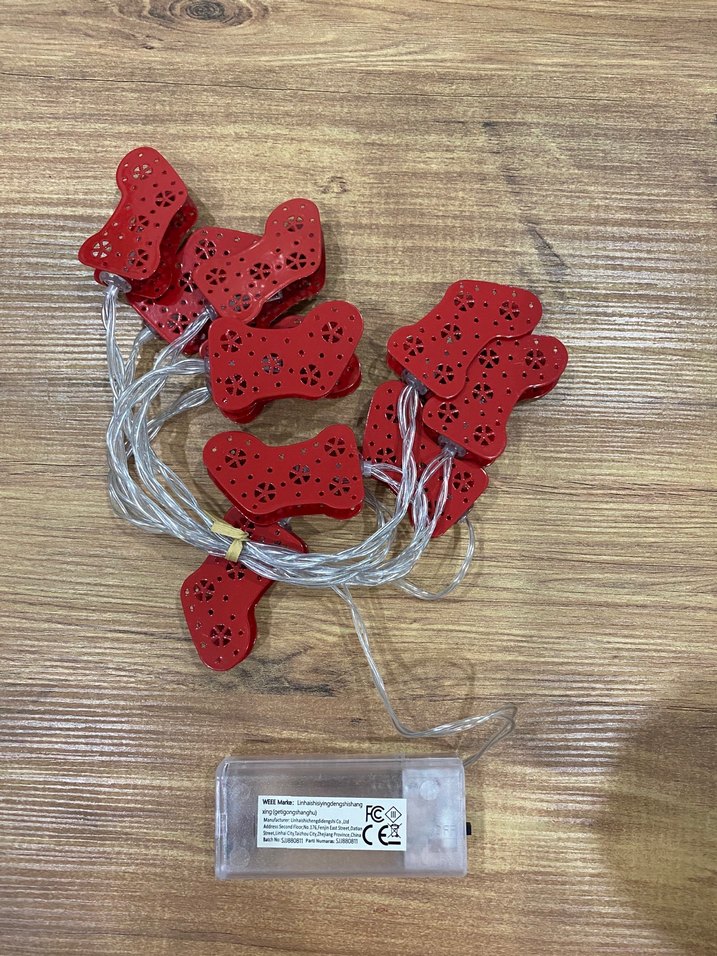 Çorap şeklinde kırmızı kapaklı dekoratif ışıklar, pil kutusuyla çalışır. Mekâna renkli bir dokunuş katar. Metal ve 2m