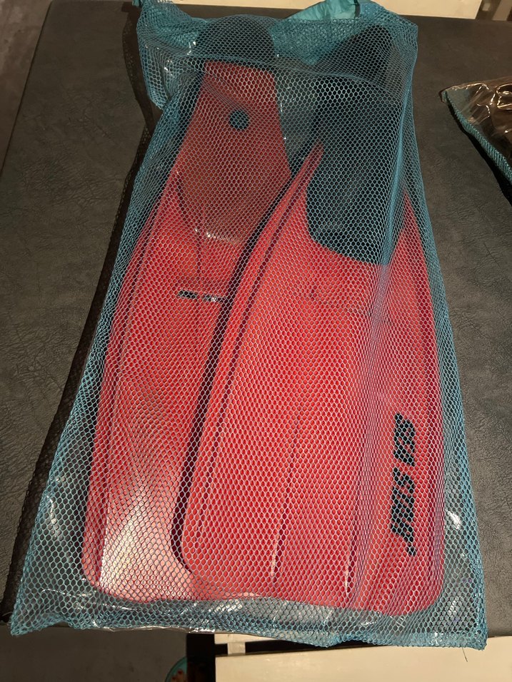 Ayarlanabilir kayışlı kırmızı dalgıç paletleri, taşıma ve havalandırma için mavi file torbada paketlenmiştir. ♂️