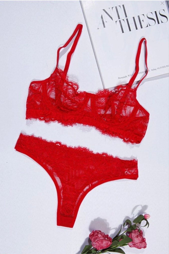 Kırmızı dantel sütyen ve külot takımı, midi uzunlukta ve renkli athleisure tarzında, ince dantel detaylara sahip. S/M/L/XL mevcuttur