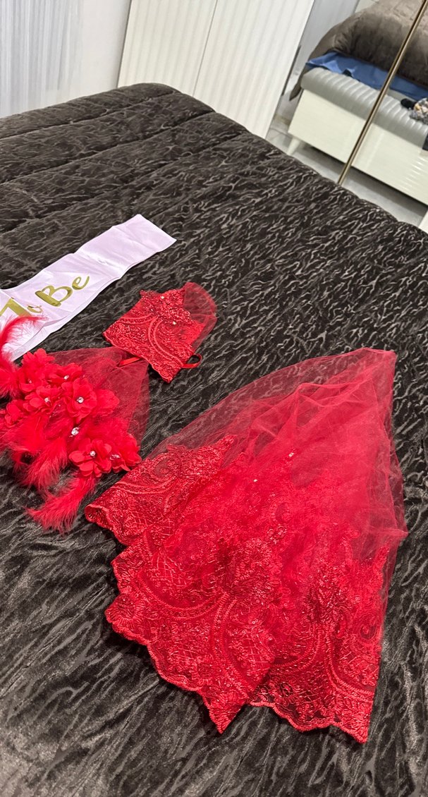 Canlı kırmızı dantel detaylı, çiçek ve tüy süslemeleriyle bohem tarzda göz alıcı bir gelin aksesuar seti. 1 eldiven 1 sıcak 1 mendil ve bride to be yazısı