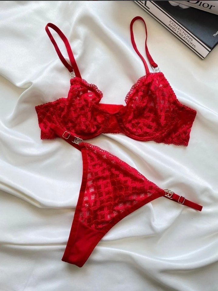 Ayarlanabilir askılı kırmızı dantel sütyen ve uyumlu dantel tanga içeren rahat bohem takım. Canlı kırmızı rengiyle dikkat çekiyor. ❤️ Bütün bedenleri mevcuttur