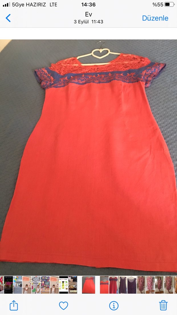 Kırmızı keten ,vücuda oturan midi elbise, tekne yaka ve düşük kol.Üst kısımda dantel işlemeleriyle bohem tarzı yansıtıyor, günlük ve gece için uygun.