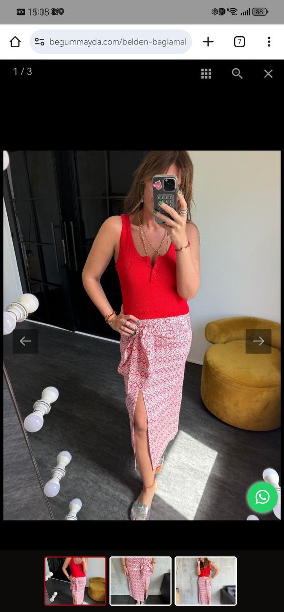 Yumuşak kumaştan, kırmızı açık tonlarda tie-dye desenli, bohem stilde, vücuda oturan midi uzunlukta etek.