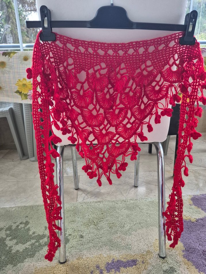 Kırmızı renkli, dantel detaylı örgü kadın şal, renkli bohem ve retro tarzı yansıtır. Hippie görünümü için uygundur.