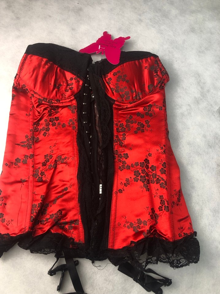 Koyu kırmızı nakışlı desenlerle süslenmiş, dantel detaylı, straplez ve vücuda oturan gotik stil bustiyer. 3 parça gönderilir.Büstiyer-String-Çorap M beden Ürünün duruşu görsellerin sonundadır. Hijyen kuralları gereği iade yoktur.✨