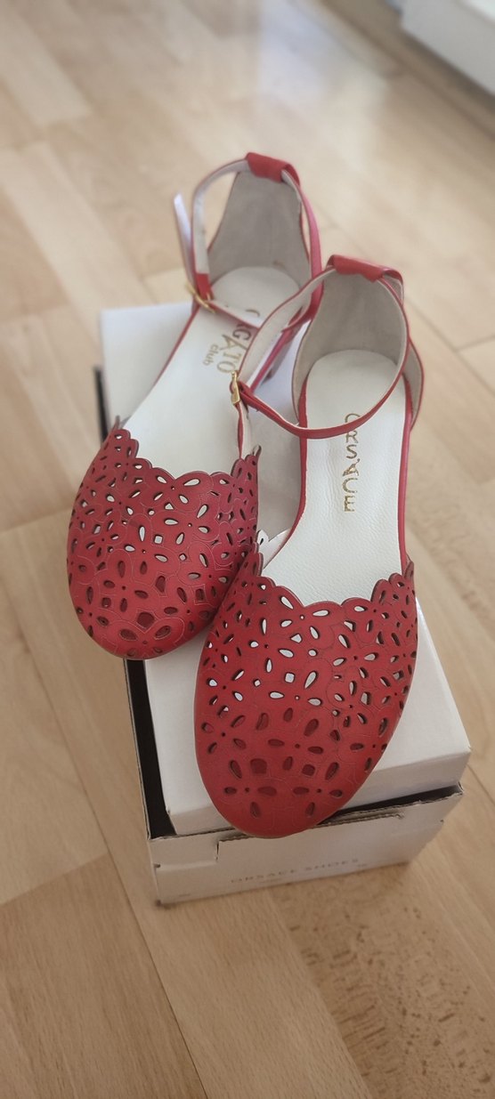 Kırmızı renkli, dantel detaylı, renkli desenlere sahip. Gerçek deri sıfır ürün kutusunda