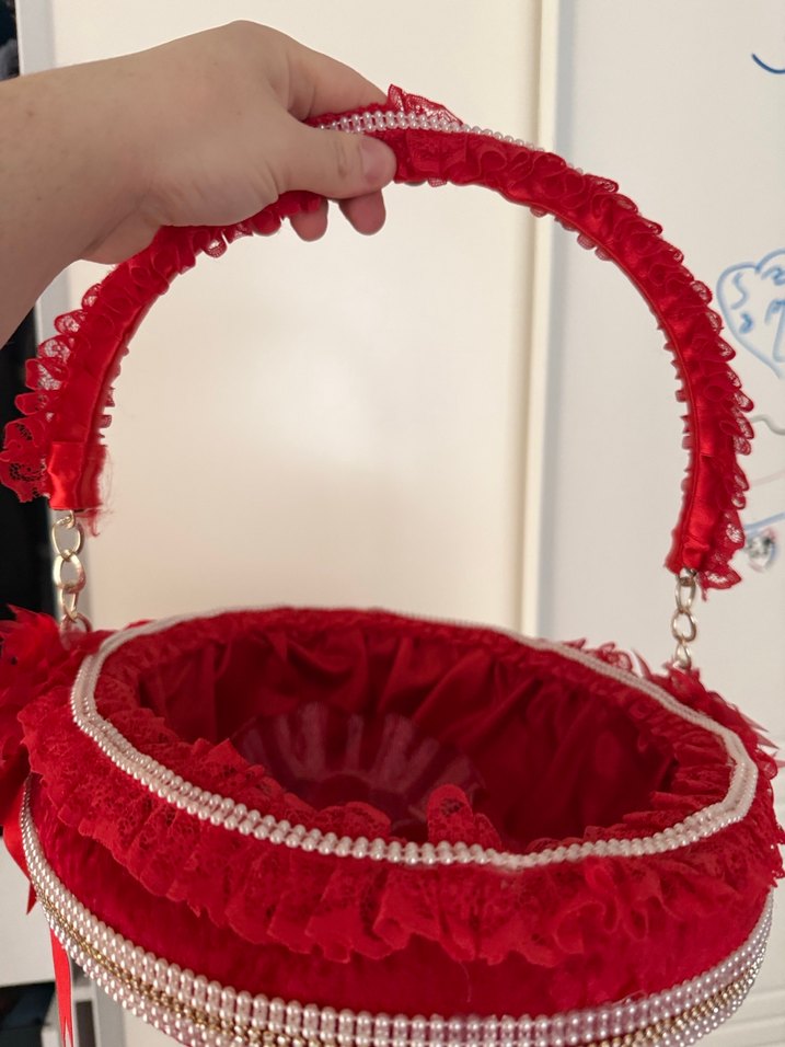 Dantel ve inci detaylı, yuvarlak saplı kırmızı sepet çanta kına tepsisi