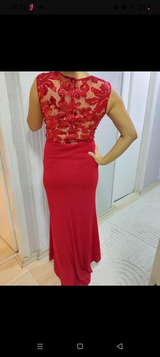 Kırmızı Dantel Detaylı Uzun Abiye Elbise