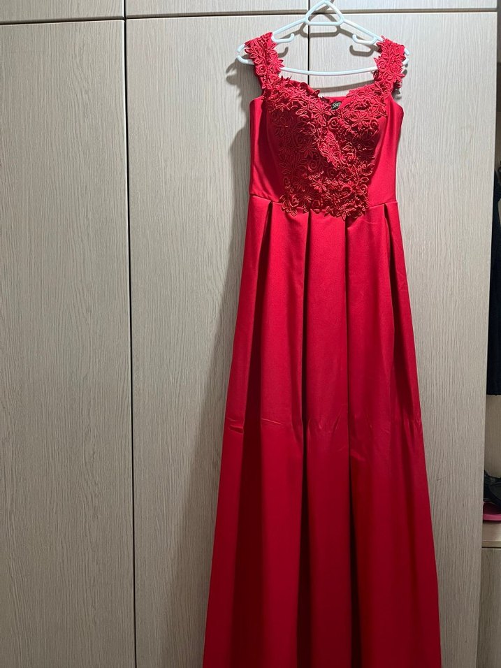 Kırmızı parlak kumaştan, V yakalı ve kolsuz, dantel işlemeli detaylara sahip, vintage ve modern klasik tarzda, düğünlere uygun, vücuda oturan uzun abiye elbise. Etiketi çıkarıldı ama hiç giyilmedi.