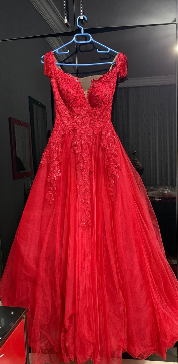 Kırmızı dantel detaylı, V yaka, straplez, kolsuz ve uzun kesim abiye elbise. 1 kere kullanıldı. Yeni gibi ve bir kusuru yok. 36 ve 38 bedene uygundur.