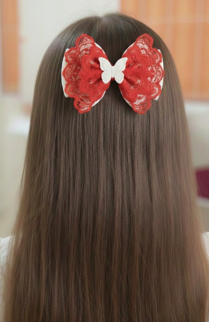 Kırmızı dantel detaylı örgü fiyonk, ortasında beyaz kelebek ile bohem ve gotik tarzlara uygun renkli tasarım toka