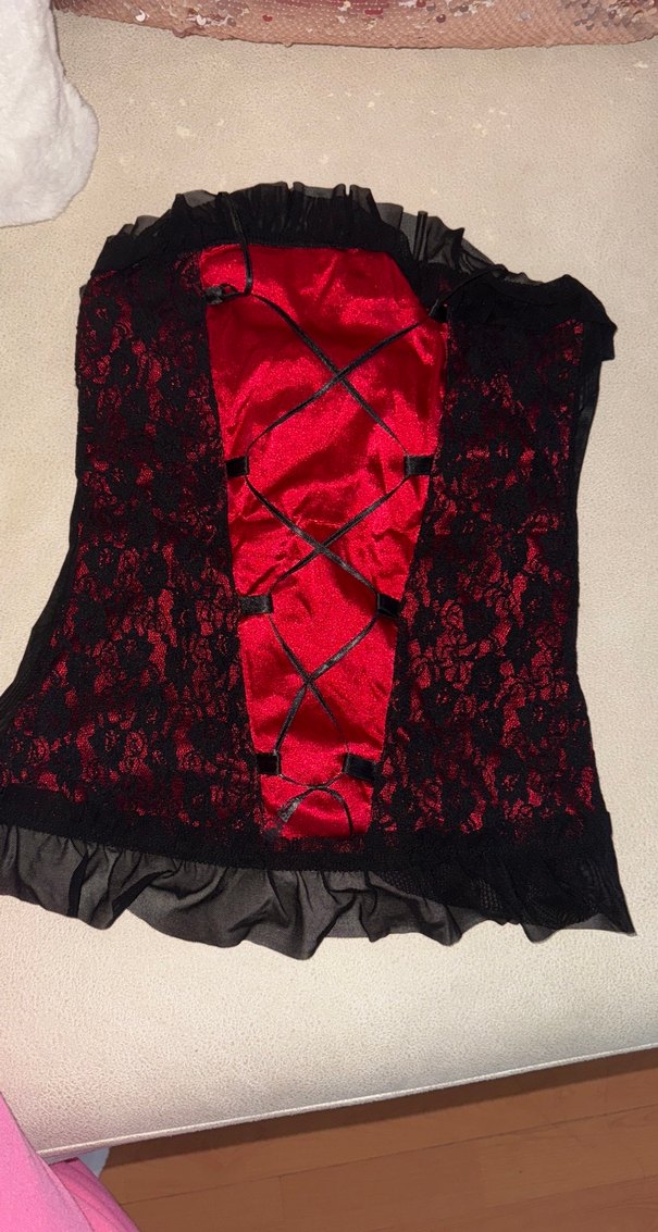 Koyu kırmızı sentetik kumaş ve işlemeli dantel detaylarıyla, straplez ve vücuda oturan bu gotik bustiyer, cesur tarzlar için romantik akşamlar uygun. ❤️