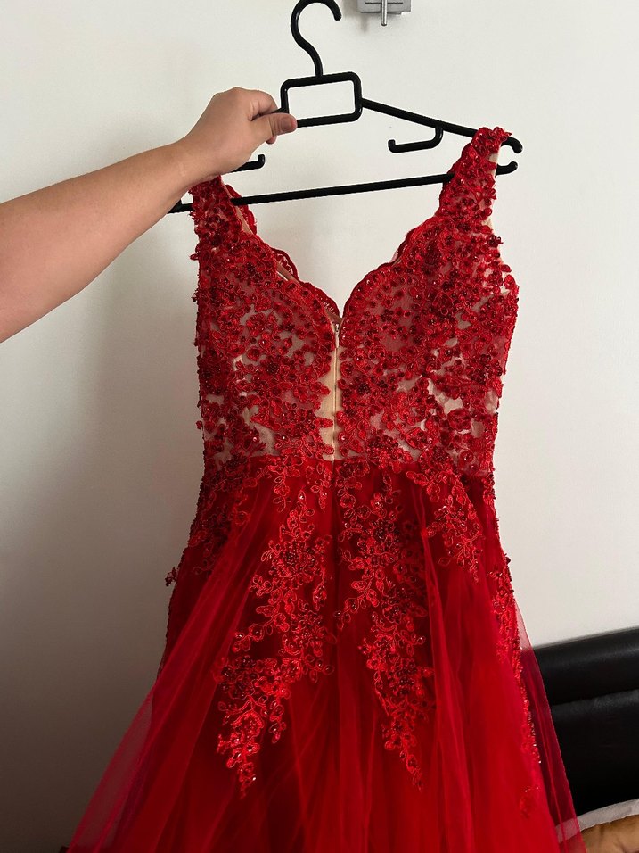 Kırmızı renkte, V yaka ve dantel işlemeli, kolsuz, desenli ve dar kesim midi boy abiye elbise. Gotik ve gösterişli tarzda, düğünler için uygun.sadece bir kez kullanıldı.