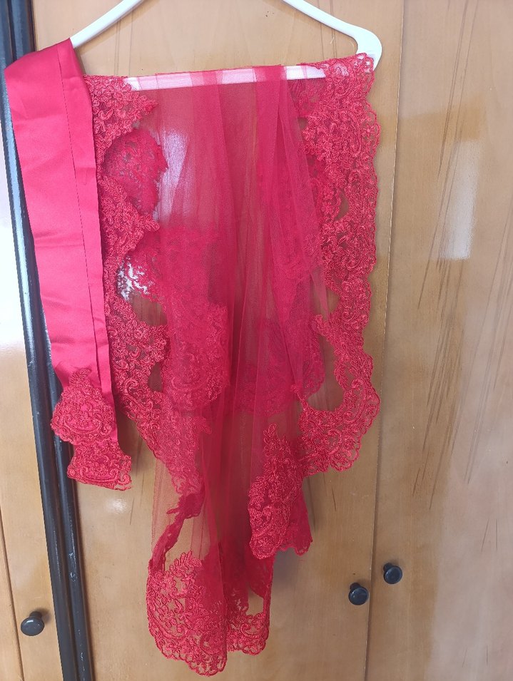 Kırmızı Dantel İşlemeli Yuvarlak Gelin Duvağı ve kurdele
