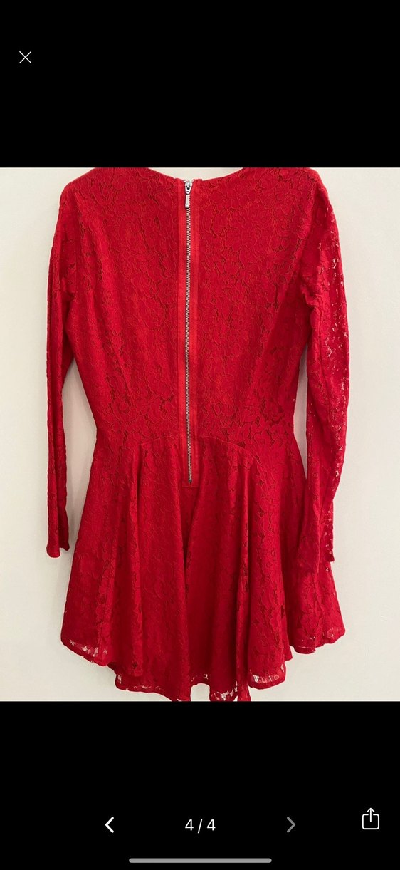 Kırmızı dantel, uzun kollu, V yaka, vintage tarzında, belden oturan midi elbise. Romantik akşamlar için uygun, sırtında fermuar bulunur. ❤️