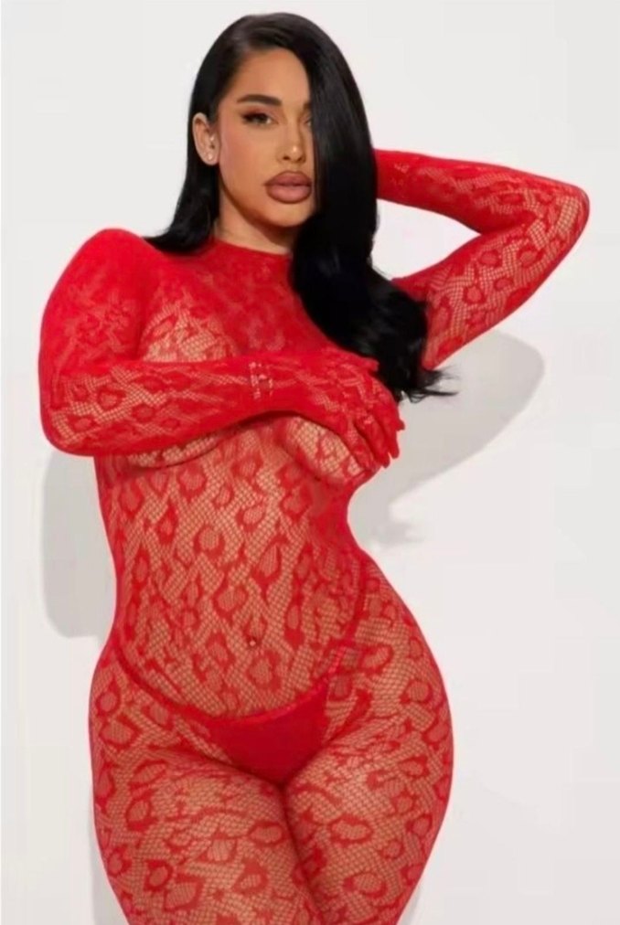 Cesur tasarımlı kadın vücut çorabı, koyu leopar desenli kırmızı dantel detaylarla romantik gece için uygun bir görünüm sunar.