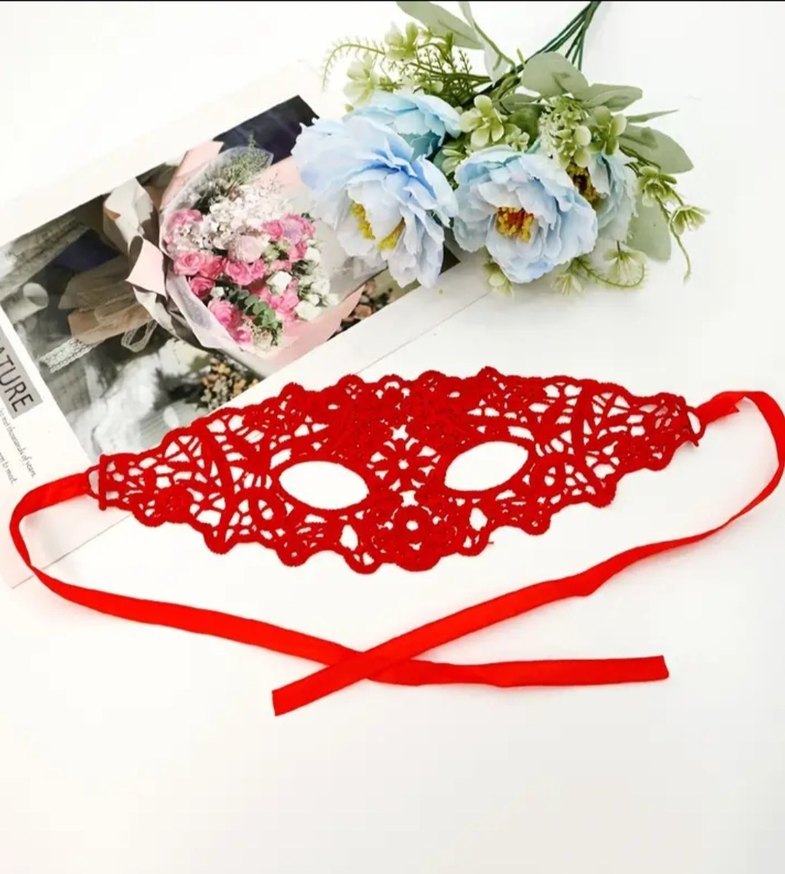 Kırmızı dantelden yapılmış, çiçek desenli ve bağlamalı kadın maskesi. Zarif bir görünüm sağlar.
