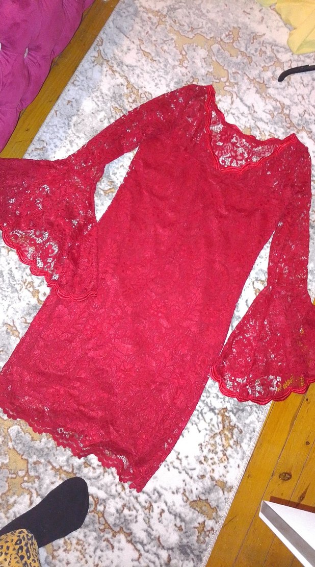 Kırmızı dantel kumaştan, bohem tarzda, uzun kolları ve V yakası olan, midi boy, vücuda oturan parti elbisesi.