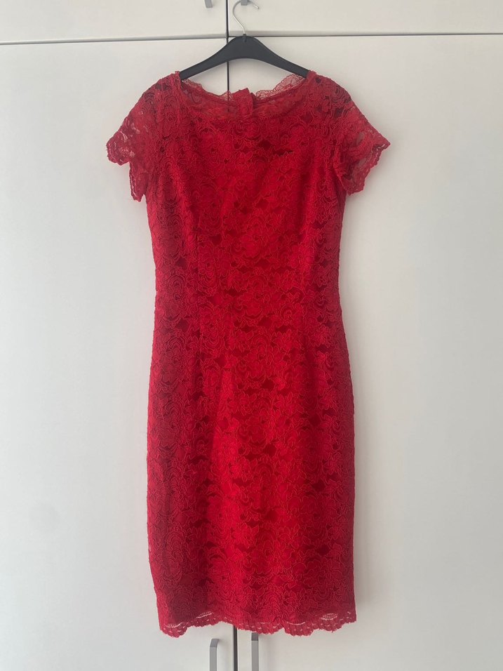 Kısa kollu, V yakalı ve kırmızı dantelden yapılmış, vintage ve modern klasik tarzda, romantik akşamlar için uygun, vücuda oturan midi elbise. ❤️