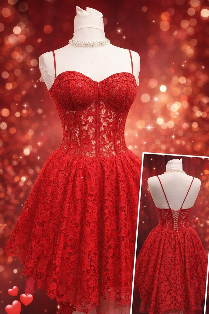 Kırmızı, nakışlı dantel detaylara sahip, straplez ve vücuda oturan midi abiye elbise. Gösterişli düğünlerde tercih edilebilir.Sevgiler gunu içinde müthiş bir tercih 38 ve 40 bedene uygundur