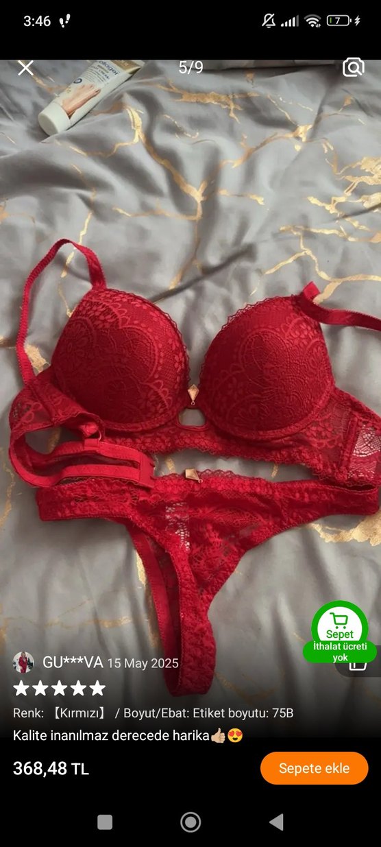 Kırmızı dantel sütyen ve tanga takımı, bohem desenli ve koyu canlı renklidir. Sepette ithalat ücreti yoktur. Shein markadır yurtdışı ürünüdür çok kaliteli yumuşacıktır 80b ve 85b mevcuttur ürün hijyen kuralları sebebiyle iadesi kesinlikle yoktur şuan vergisiyle birlikte bin TL den fazla, iade almadığım için uyguna koyuyorum sıfır ürün ihtiyaç fazlası