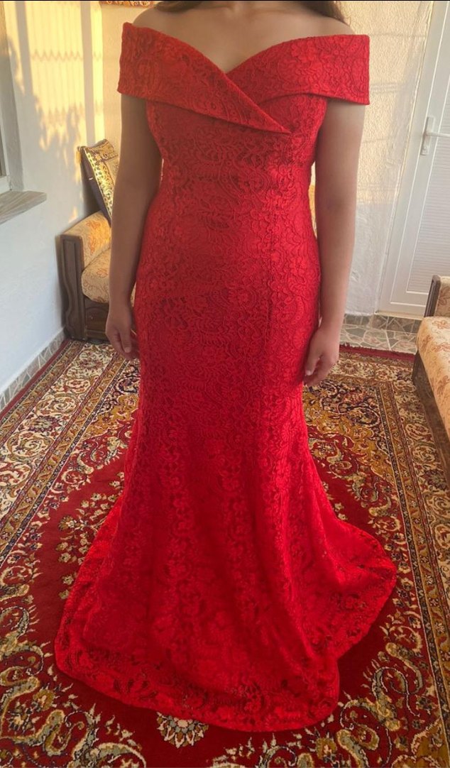 Kırmızı dantel kumaştan, uzun ve dar kesim abiye elbise. Kayık yaka ve kolsuz tasarımı ile klasik ve gösterişli bir şıklık sunar. Düğün gibi özel anlar için ideal. 44 beden ama 42/40 bedene de olur bir kez kullanıldı temiz bir elbise