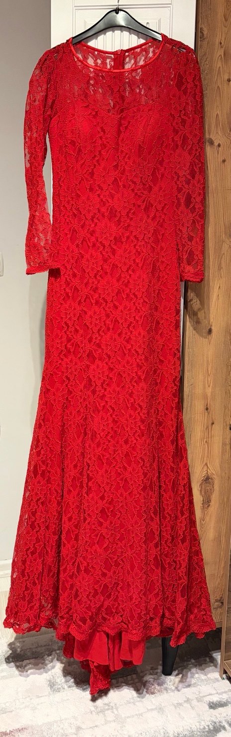 Koyu kırmızı dantelden yapılmış, uzun kollu ve tekne yakalı, vücuda oturan uzun abiye elbisedir.