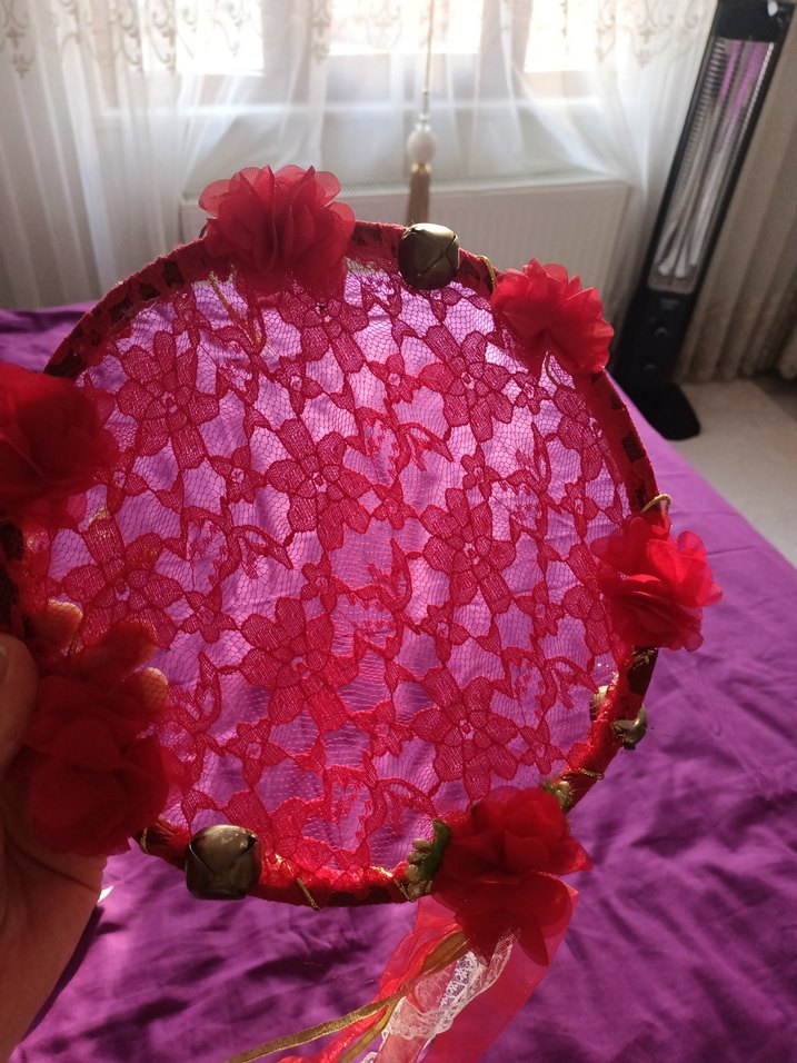 Kırmızı dantel çiçek desenli, etrafı küçük çanlarla süslenmiş, kurdelelerle tamamlanmış bohem tarzda el yapımı tef.