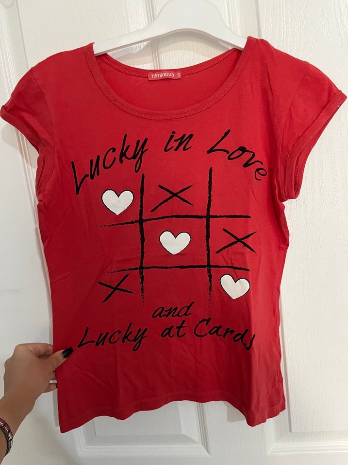 Pamuklu kırmızı tişört, kısa kollu ve yuvarlak yakalıdır. Dantel detaylı ve renkli baskılı, romantik temalı, günlük sokak stili için uygundur. ❤️