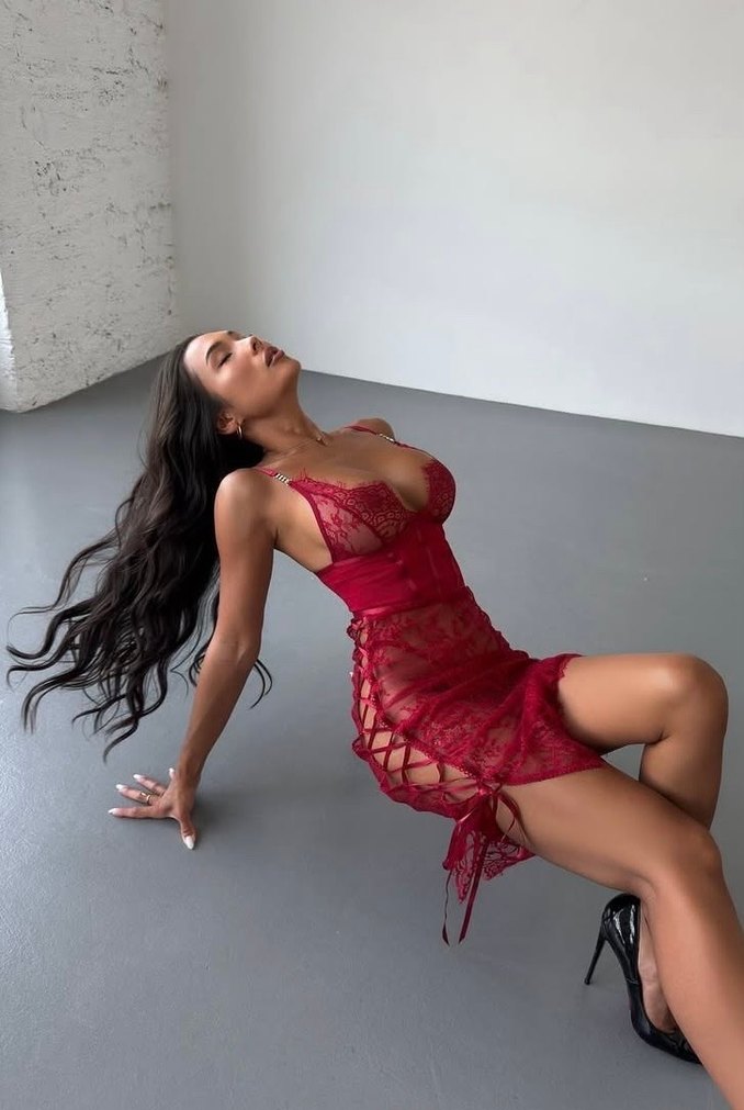 Kırmızı dantel detaylarla süslenmiş, ipeksi kumaştan yapılmıştır. Cesur ve göz alıcı bir görünüm sunar.