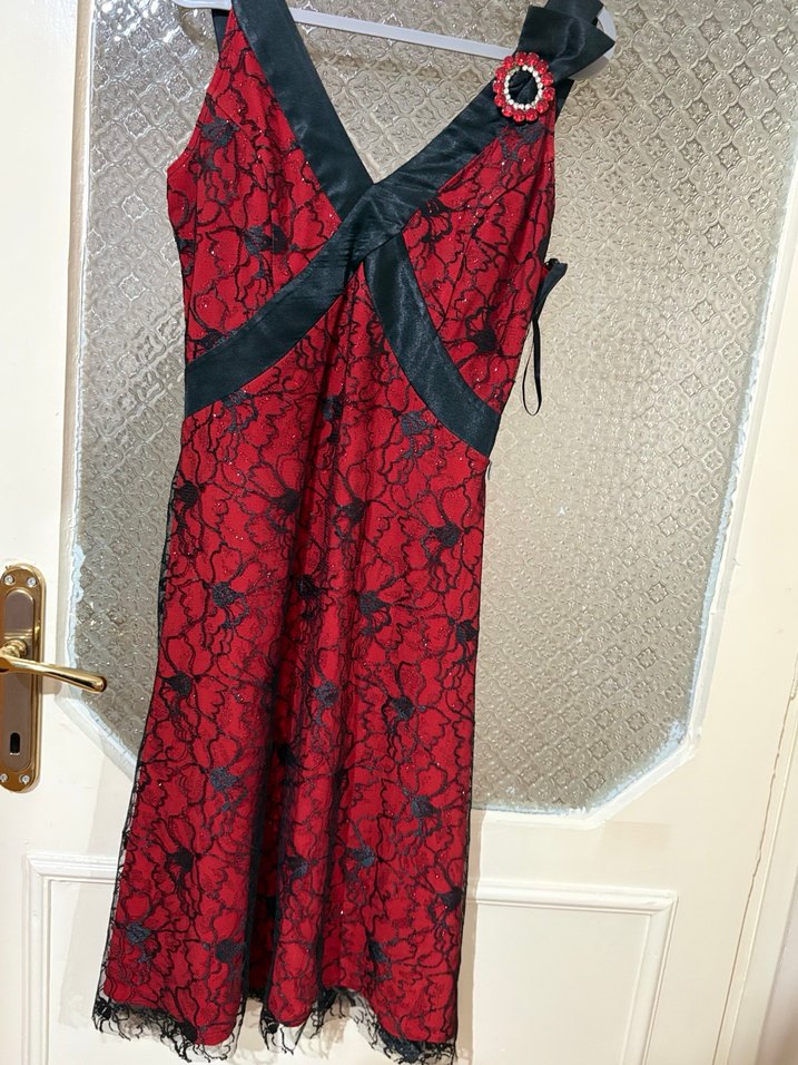 S m beden olur dantel detaylı, siyah desenli gotik uzun abiye elbise. İnce askılı, V yakalı ve vücuda oturan kesimiyle romantik akşamlar için ideal.