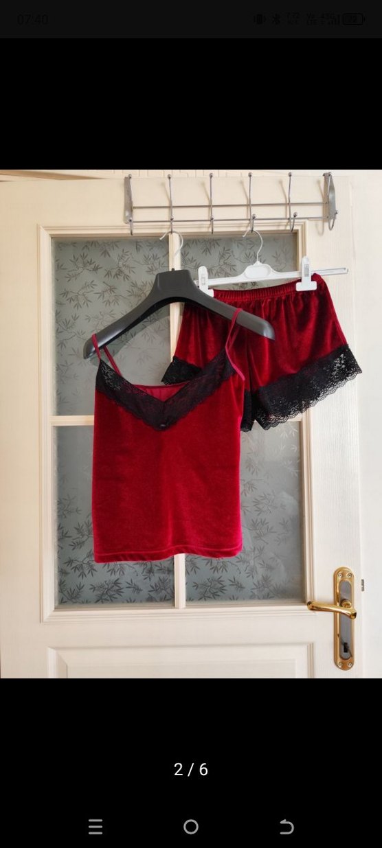 Kırmızı Dantelli Kadın Mini kadife Pijama Takımı