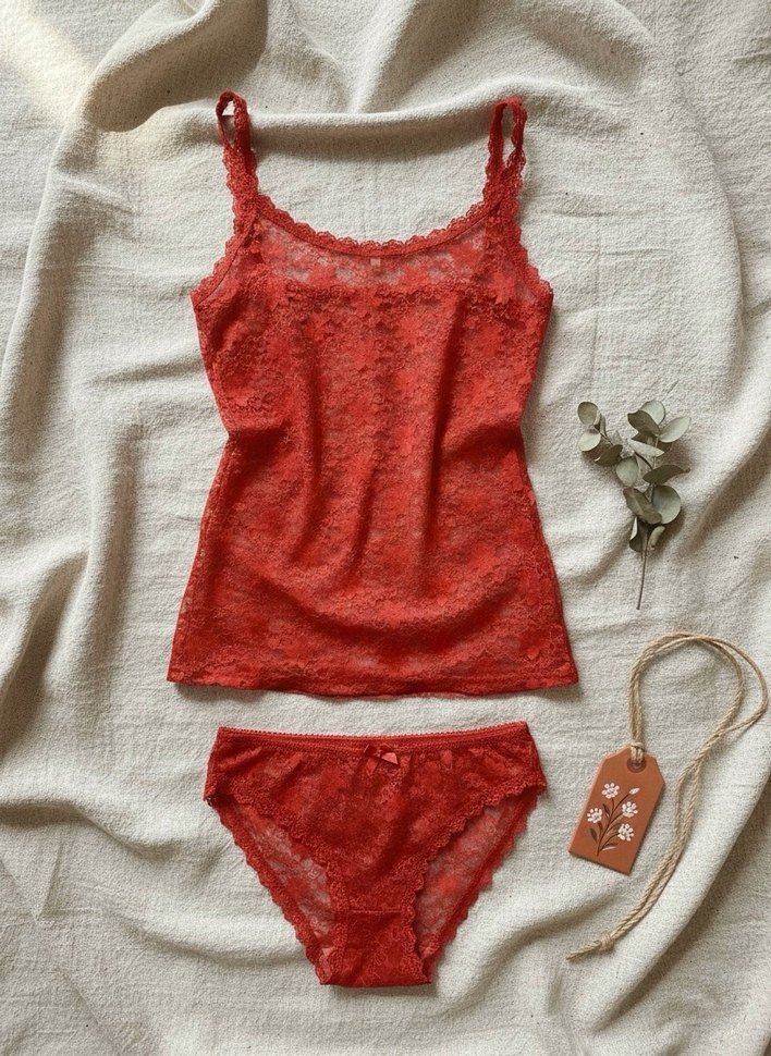 Hafif kırmızı renkte, bohem tarzda rahat dantelli kadın iç giyim seti. Midi uzunlukta atlet ve uyumlu külot içerir.