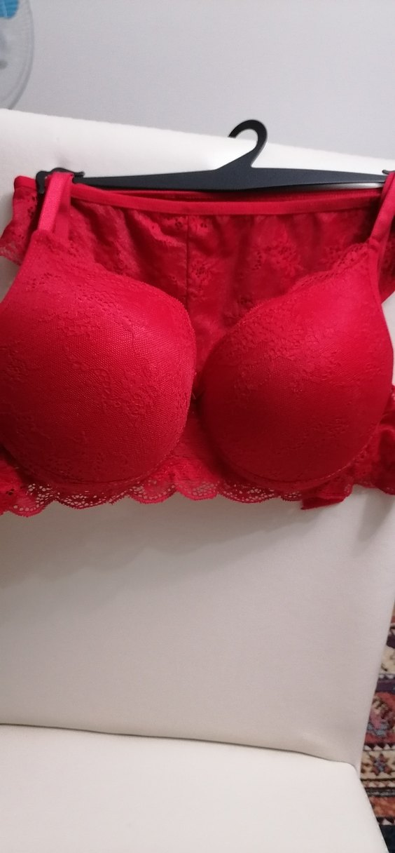 Kırmızı renkte, dantelli detaylara sahip midi uzunlukta, desen içermeyen minimalist ve klasik tarzda sütyen takimi. ❤️90 beden